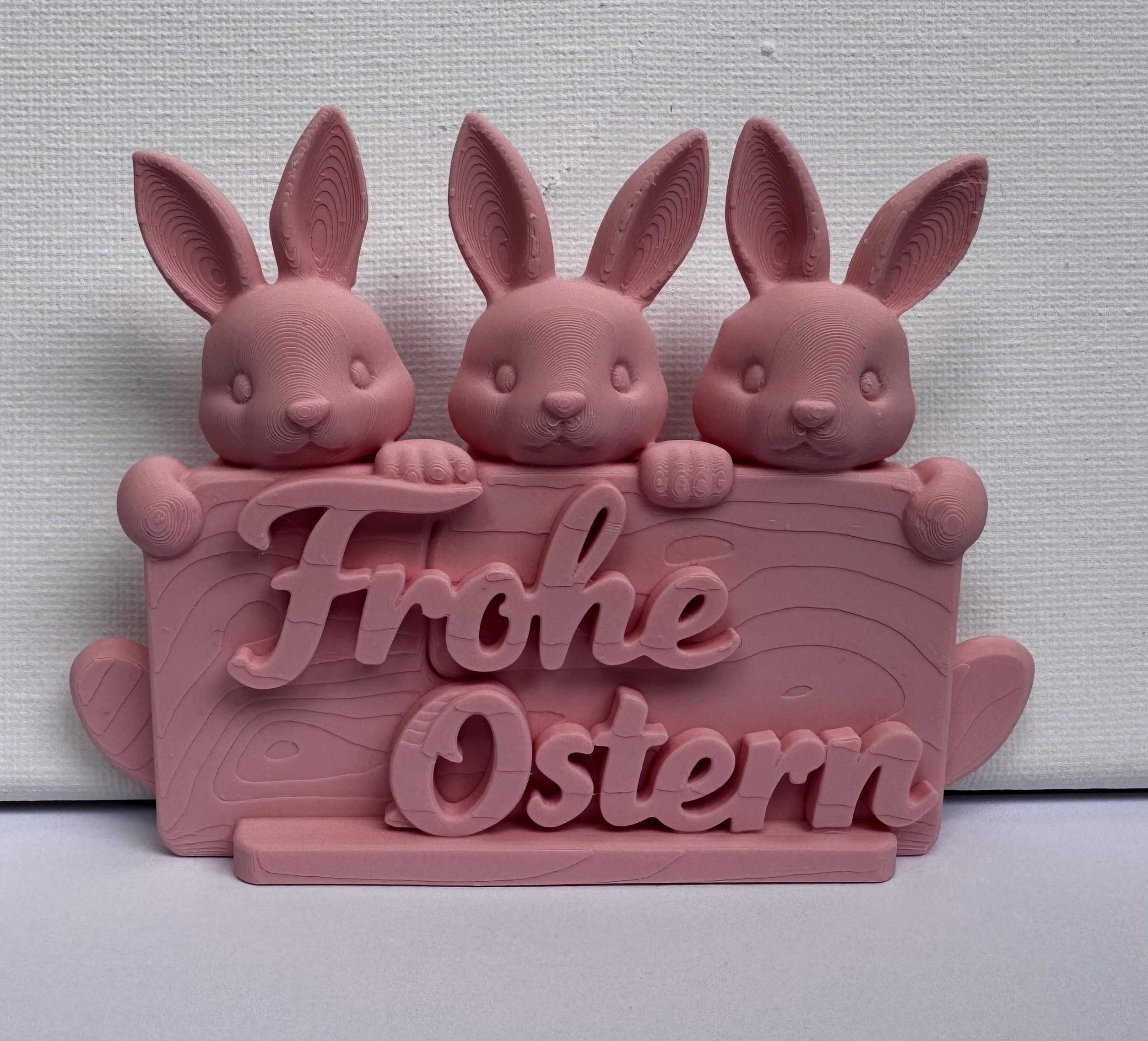 Dieses dekorative „Frohe Ostern“ Schild mit drei Hasen ist eine hochwertige, moderne Osterdekoration aus dem 3D-Druck.