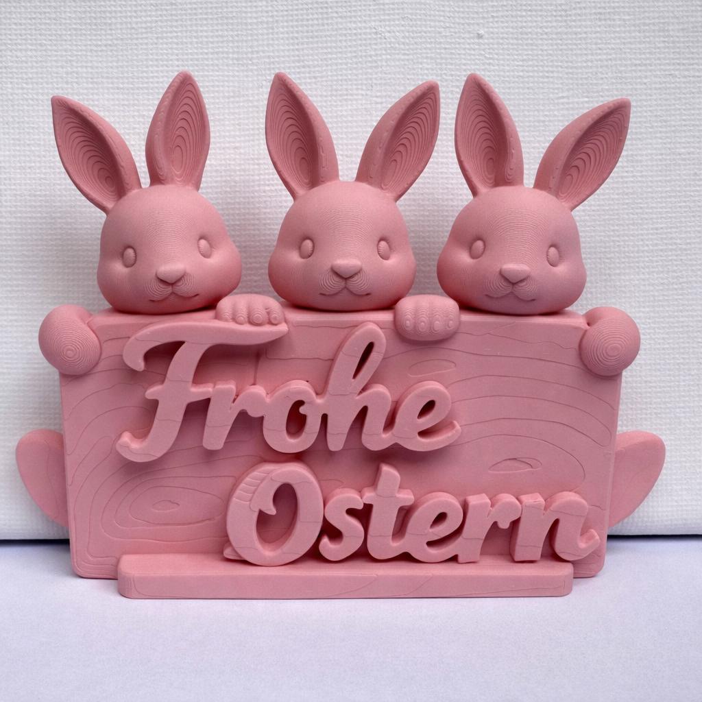 Dieses dekorative „Frohe Ostern“ Schild mit drei Hasen ist eine hochwertige, moderne Osterdekoration aus dem 3D-Druck.
