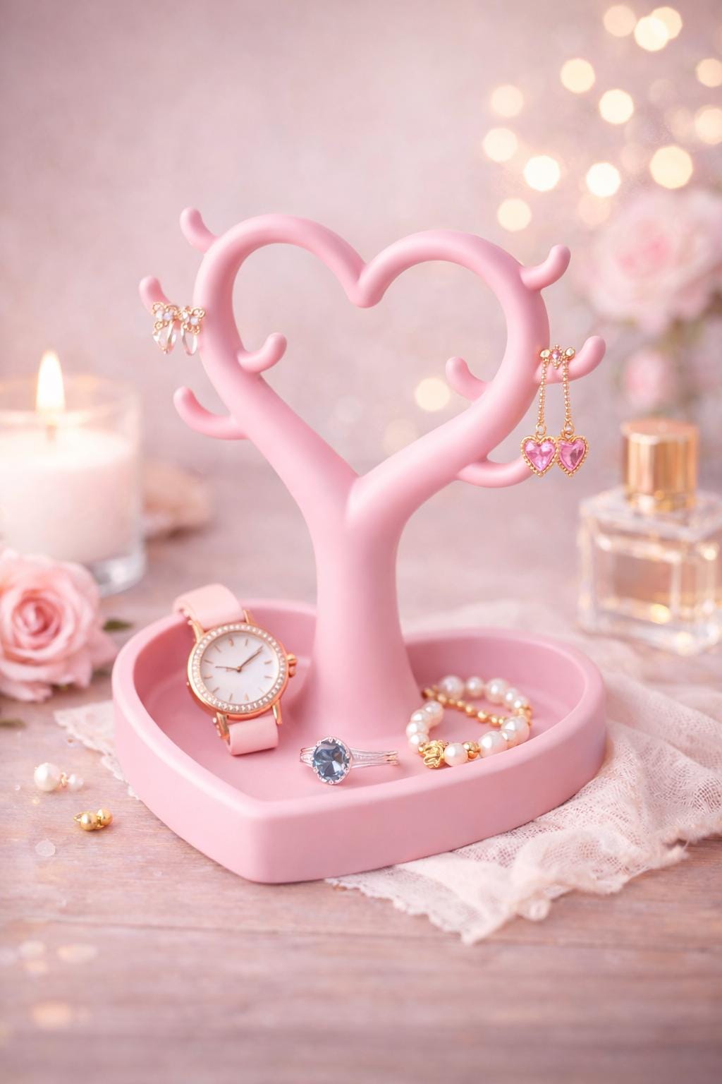 The curved tree shape offers multiple hanging options for earrings and necklaces, while the heart-shaped shelf provides space for rings, watches and small pieces of jewelry.