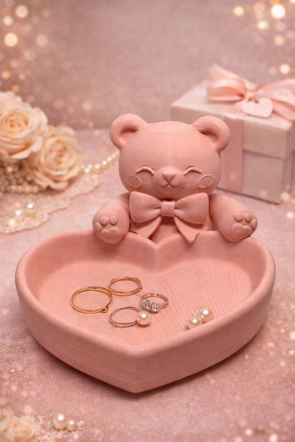 This handcrafted heart-shaped bowl with a bear figurine is the perfect combination of cute design and practical function. Ideal as a jewelry tray for rings, earrings, keys, or small keepsakes.
