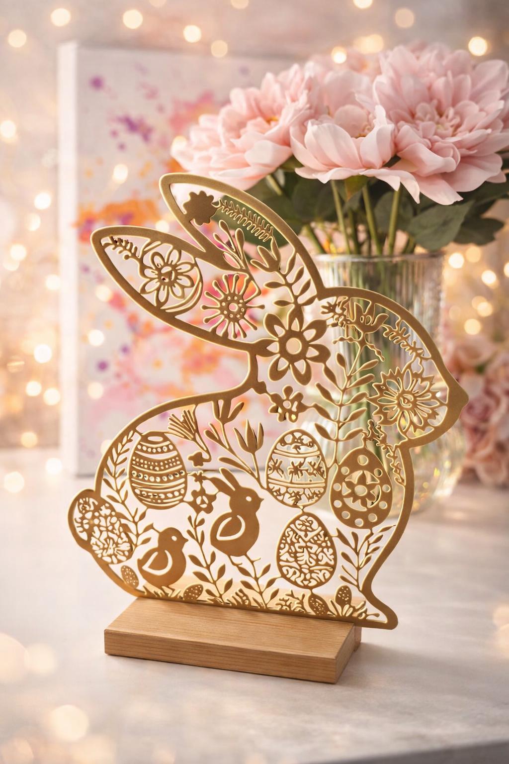 This decorative Easter bunny combines modern design with charming spring details.