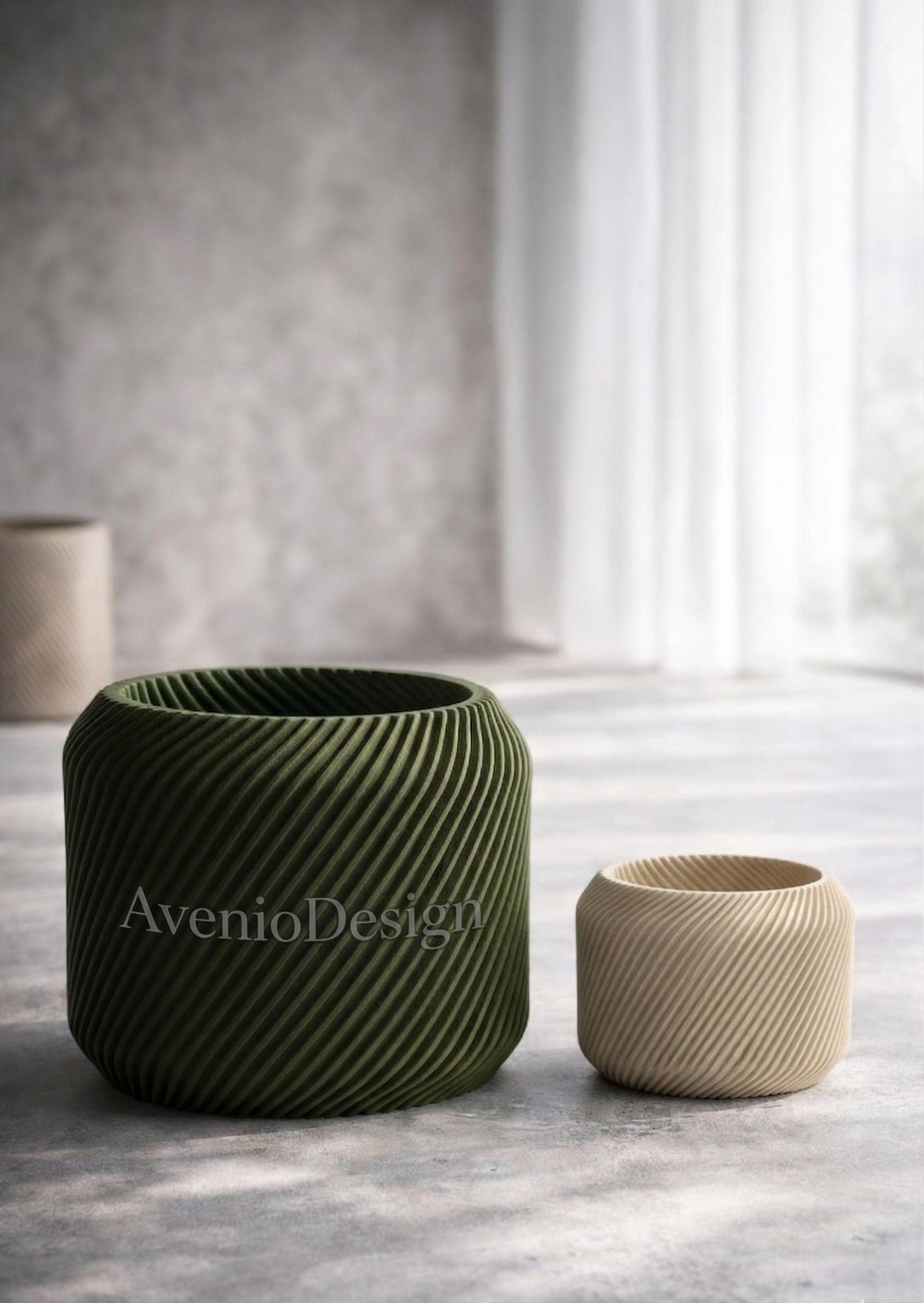 This set of two ribbed plant pots made of PLA combines modern design with a clean, high-quality surface texture. The twisted ribbed pattern gives the pots a distinctive design character and makes them a striking eye-catcher on windowsills, sideboards, shelves, or desks.